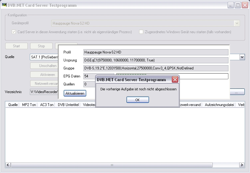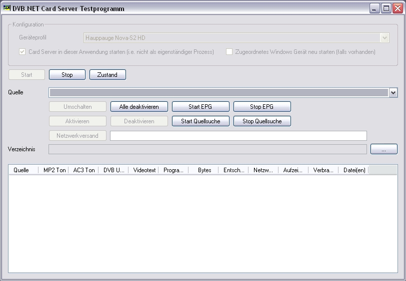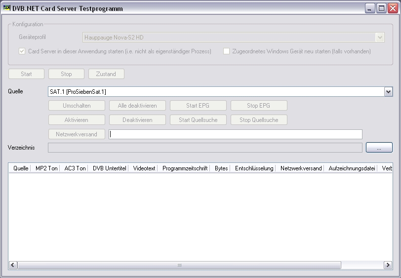 Nach dem Starten der Card Server Instanz sind nun auch die anderen Schaltflächen aktiv, soweit sie Sinn machen - auf eine Quellgruppe (früher Transponder genannt) kann nur dann umgeschaltet werden, wenn irgendeine zugehörige Quelle ausgewählt wurde.