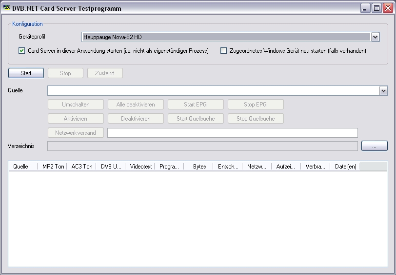 Direkt unter der Auswahl des Geräteprofils können noch zwei Optionen angewählt werden, die Abbildung zeigt die für den Normalfall übliche Auswahl - wenn etwa das Card Server Testprogramm als Ersatz für den Stream Manager der Vorgängerversionen herhalten soll. Ist die erste Option aktiviert, so wird für den Zugriff auf die DVB Hardware kein eigenständiger Prozess gestartet. In der Voreinstellung ist die Option deaktiviert, allerdings merkt sich das Testprogramm diese Auswahl sowie das verwendete Geräteprofil für den nächsten Aufruf.