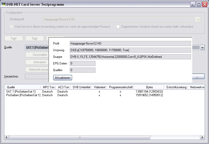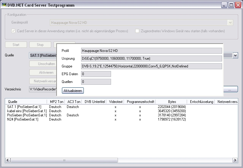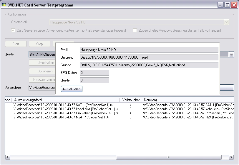 Als letzte Information zu einer aktiven Quelle wird auch noch die Zahl der verwendeten Teildatenströme angezeigt. Dies kann bei Einsatz einer DVB Hardware mit beschränkten Empfangsmöglichkeiten wie der Hauppauge Nexus (TechnoTrend Premium Line 2300) für die Abschätzung, ob weitere Quellen parallel aufgezeichnet werden können, von Bedeutung sein.