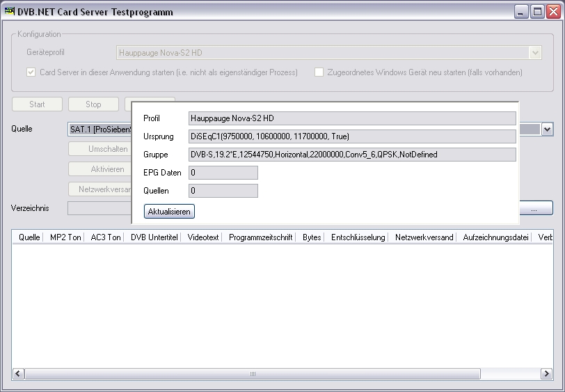 Dazu wird eine Quelle ausgewählt und dann mit der Schaltfläche unmittelbar darunter die zugehörige Quellgruppe (früher Transponder genannt) angewählt. Dieser Vorgang deaktiviert immer auch alle aktiven Quellen - selbst wenn sich durch die Operation die Quellgruppe gar nicht verändern würde. So ist sicher gestellt, dass der interne Zustand der Card Server Instanz in einem gewissen Maße zurück gesetzt wurde.