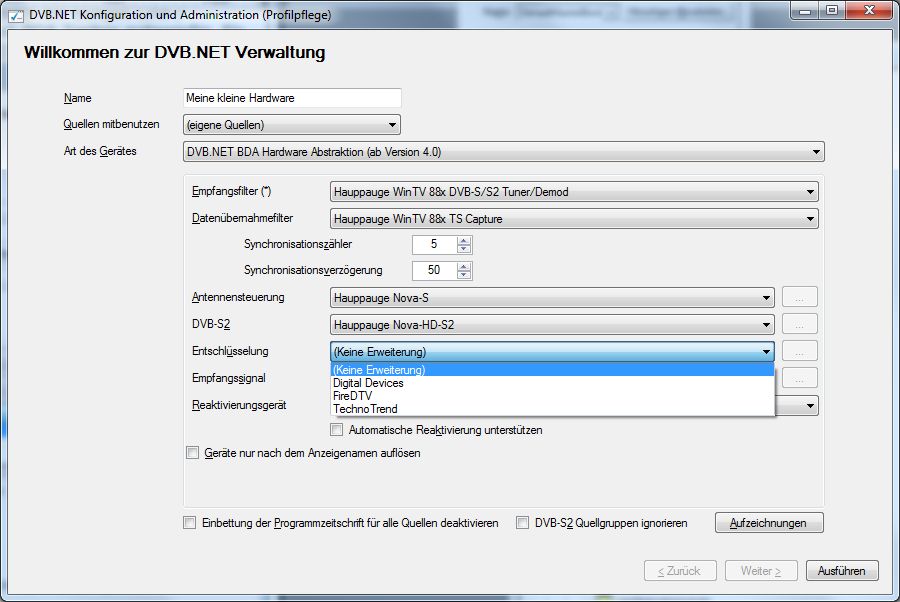 Die Basisarchitektur von DVB.NET sieht eine dynamische Erweiterung dieser Alternativen bereits fest vor. Je nach vorhandenen herstellerspezifischen Bibliotheken im Adapter Unterverzeichnis des DVB.NET Installationsverzeichnis können weitere Alternativen zur Auswahl angeboten sein. Diese sind zum Zeitpunkt der Erstellung dieser Beschreibung noch nicht Bestandteil des Produktes gewesen.