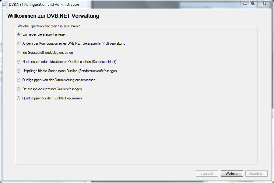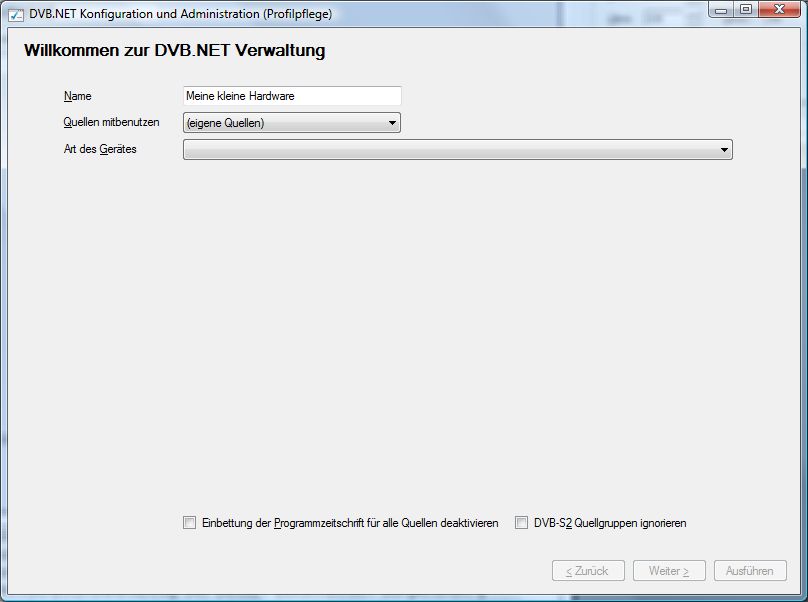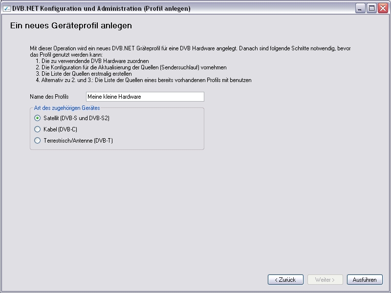 Im Folgenden werden erst einmal der Name des Profils und die Art des DVB Empfangs festgelegt. Bei dem Namen ist zu beachten, dass dieser als Dateiname zur physikalischen Ablage des Geräteprofils auf der lokalen Festplatte verwendet wird, so dass die übliche Einschränkung bei der Auswahl der verwendeten Zeichen gilt - ein Doppelpunkt darf zum Beispiel nicht im Namen vorkommen. Zudem muss der Name eines Geräteprofils eindeutig sein, das heisst, es darf keine zwei DVB.NET Geräteprofile mit gleichem Namen geben - es wird hier wie bei Dateien nicht zwischen Gross- und Kleinschreibung unterschieden, so dass etwa Nexus und NEXUS identische Geräteprofile bezeichnen würden.