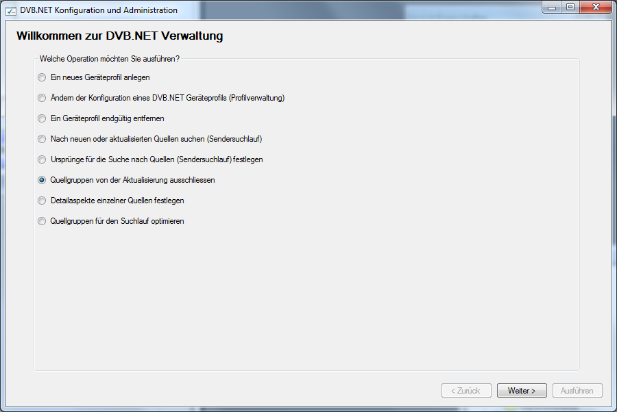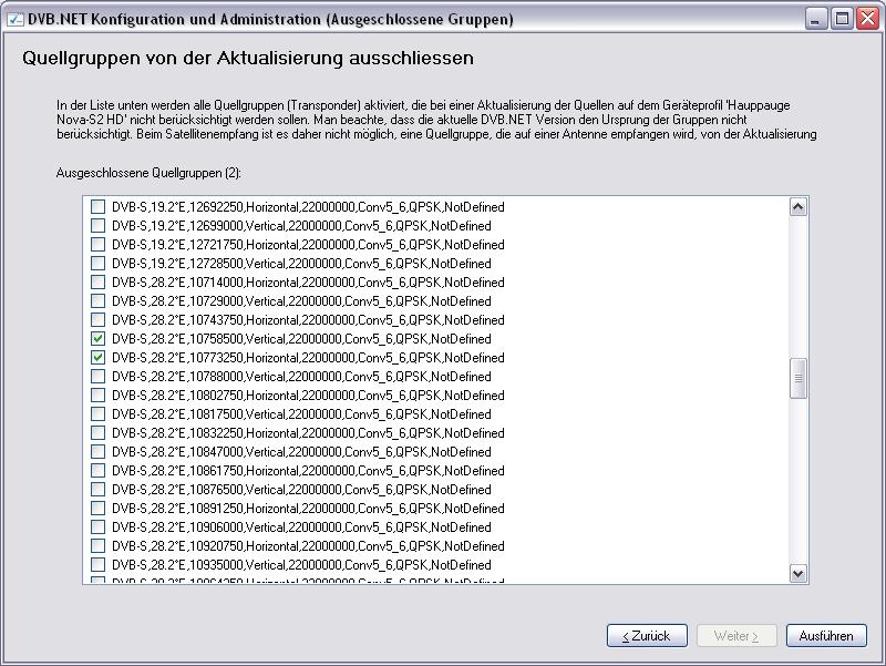 Jede Quellgruppe wird hier mit ihrem technisch eindeutigen Namen visualisiert, angekreuzte Quellgruppen werden von der Aktualisierung ausgeschlossen. Wenn eine Quellgruppe neu ausgeschlossen wird, sollte eine Aktualisierung durchgeführt werden, an deren Abschluss keine Zusammenführung der Listen der Quellen erfolgt, sondern die Liste ganz neu erstellt wird - da ansonsten die Quellen der Quellgruppe weiterhin sichtbar bleiben und eventuell mit veralteten Informationen gearbeitet wird. Wird umgekehrt der Ausschluss einer Quellgruppe aufgehoben, so reicht natürlich eine normale Aktualisierung mit Zusammenführung.