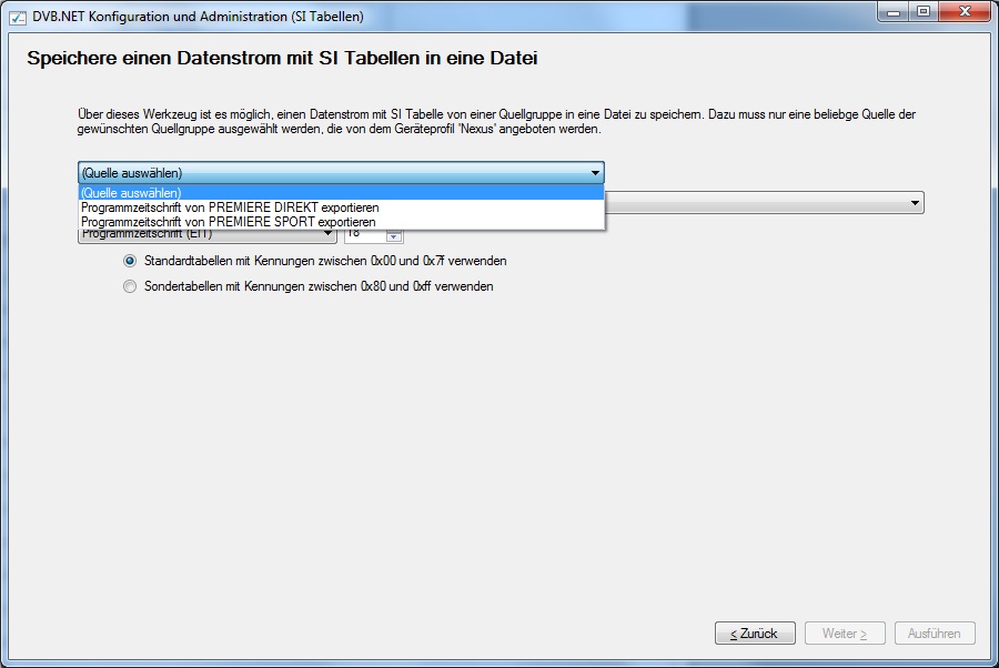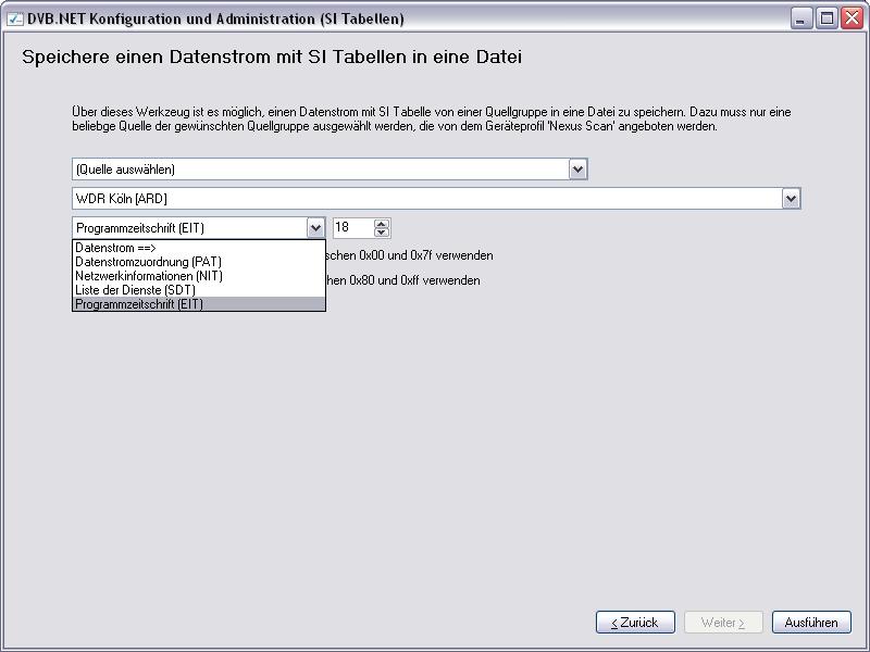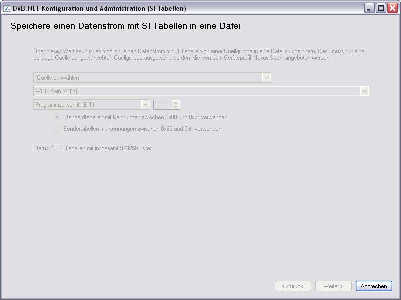 Wird die Schaltfläche unten rechts aktiviert, so beginnt die Übertragung des gewünschten Datenstroms mit SI Tabellen in eine Datei, deren Name dabei abgefragt wird. Der Vorgang wird durch die selbe Schaltfläche beendet - die Beschriftung ändert sich entsprechend. Während der Übertragung visualisiert eine Statusanzeige die bisher erhaltenen SI Tabellen sowie die gesamte Anzahl von empfangenen Bytes auf dem Datenstrom.