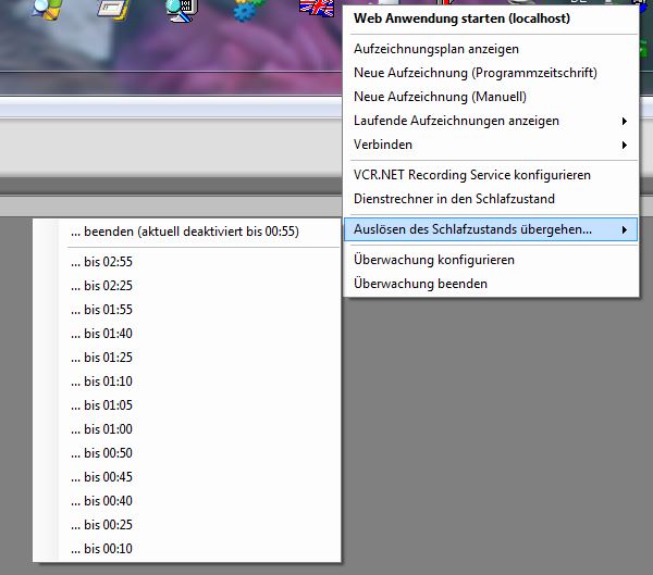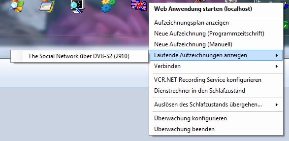 Die VCR.NET Überwachung wird automatisch beim Anmelden eines Anwenders gestartet. Dabei wird kein Fenster geöffnet, sondern es werden lediglich Symbole im sogenannten System Tray der Windows Taskleiste erzeugt, über deren Hintergrundfarbe der Zustand der überwachten VCR.NET Server angezeigt wird. Das Kontextmenü der Symbole erlaubt einen schnellen Einsprung in die Web Anwendung des VCR.NET Recording Service sowie die Konfiguration der Überwachung selbst. |