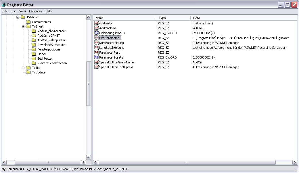 Für den ClickFinder wird das VCR.NET Werkzeug als so genanntes AddOn registriert. Dazu kann die Datei TVBrowserPlugIn.reg eingespielt, die sich im Browser PlugIns Unterverzeichnis des VCR.NET Installationsverzeichnis befindet. Danach muss manuell in der Windows Registrierung der Pfad zum VCR.NET Werkzeug angepasst werden - die Voreinstellung ist für die Standardinstallation auf einem englischen Windows XP passend. Veränderungen an der Windows Registrierung sind wie gewohnt mit der angebrachten Vorsicht vorzunehmen. |