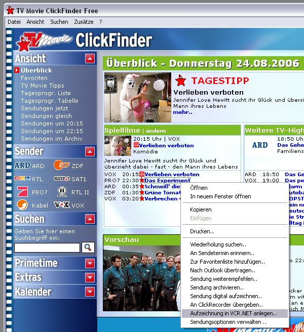 Nun kann ganz analog zum TVBrowser eine Aufzeichnung über das Kontextmenü im VCR.NET angelegt werden - auch die weitere Bedienung erfolgt wie beim TVBrowser beschrieben, ein Löschen von Aufzeichnungen ist allerdings nicht implementiert. |