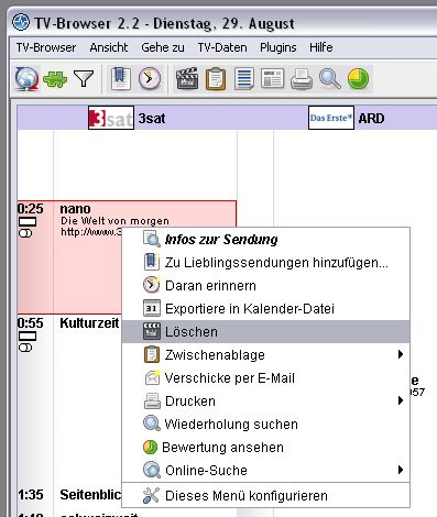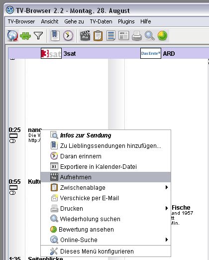 Weitere Einstellungen sind im Allgemeinen nicht notwendig. Insbesondere werden die Vor- und Nachlaufzeiten von Aufzeichnungen im VCR.NET Werkzeug festgelegt und sollten hier auf 0 stehen. Nun kann zum Beispiel über das Kontextmenü einer Sendung eine Aufzeichnung im VCR.NET angelegt werden. |